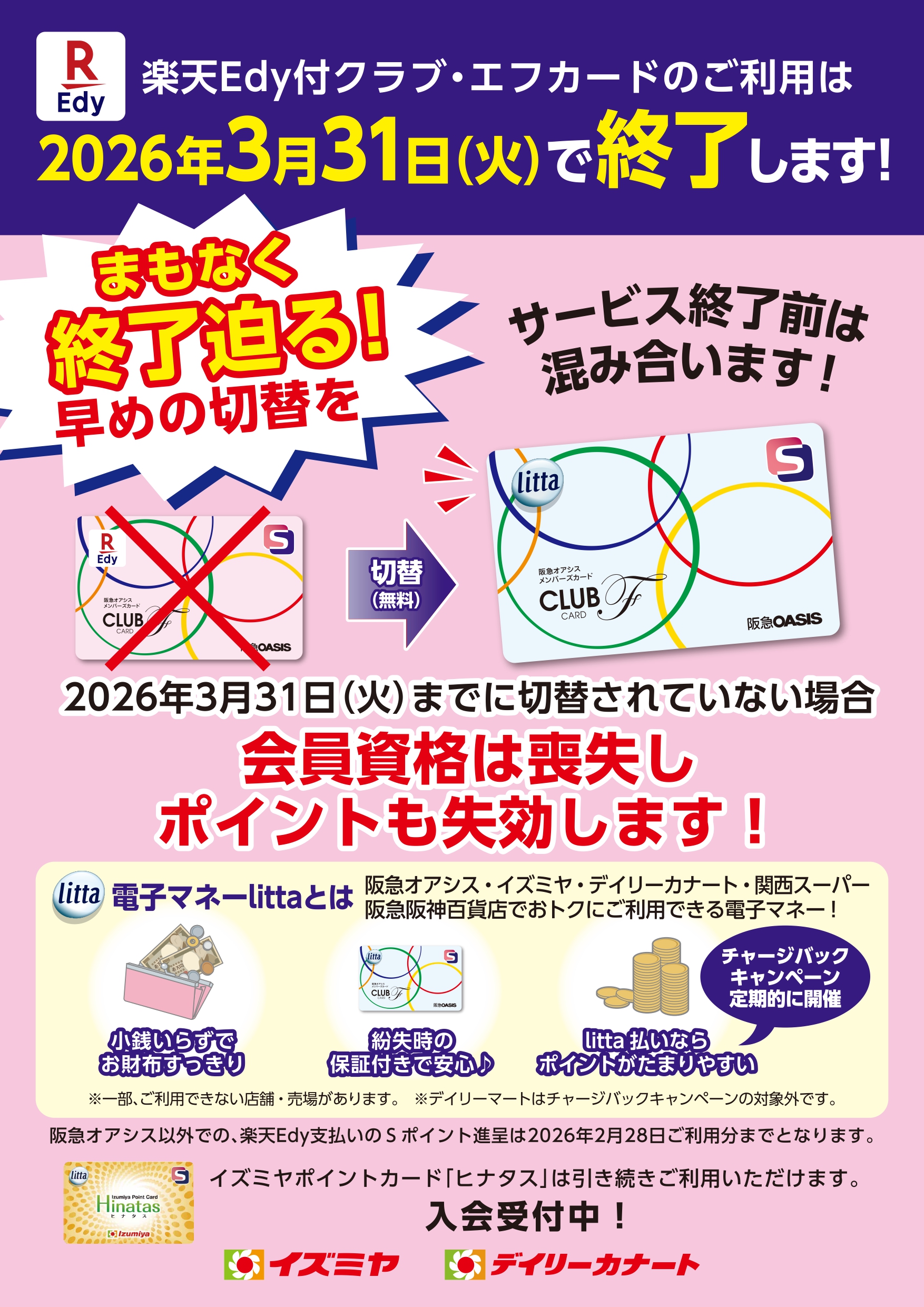 2026.01.01 なし 楽天Edy付クラブ・エフカードのご利用は2026年3月31日(火)で終了します! ▶Web切替はこちらから ▶Webでカンタン!切替ガイドはこちら 前の記事 次の記事 特集一覧へ戻る