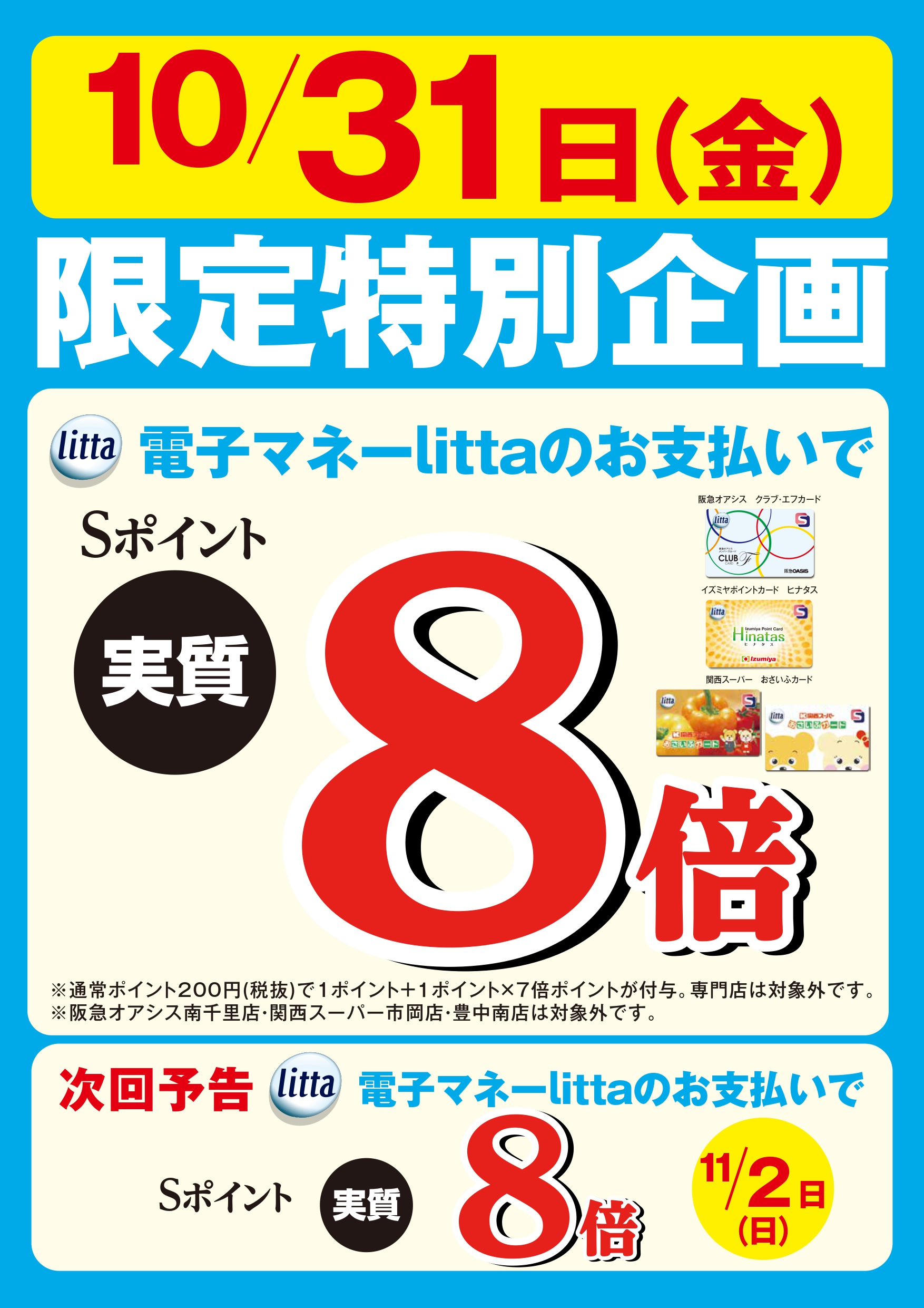 10月31日(金)限定特別企画!クラブ・エフカード、ヒナタスカード搭載 電子マネーlittaのお支払いでSポイント実質8倍!