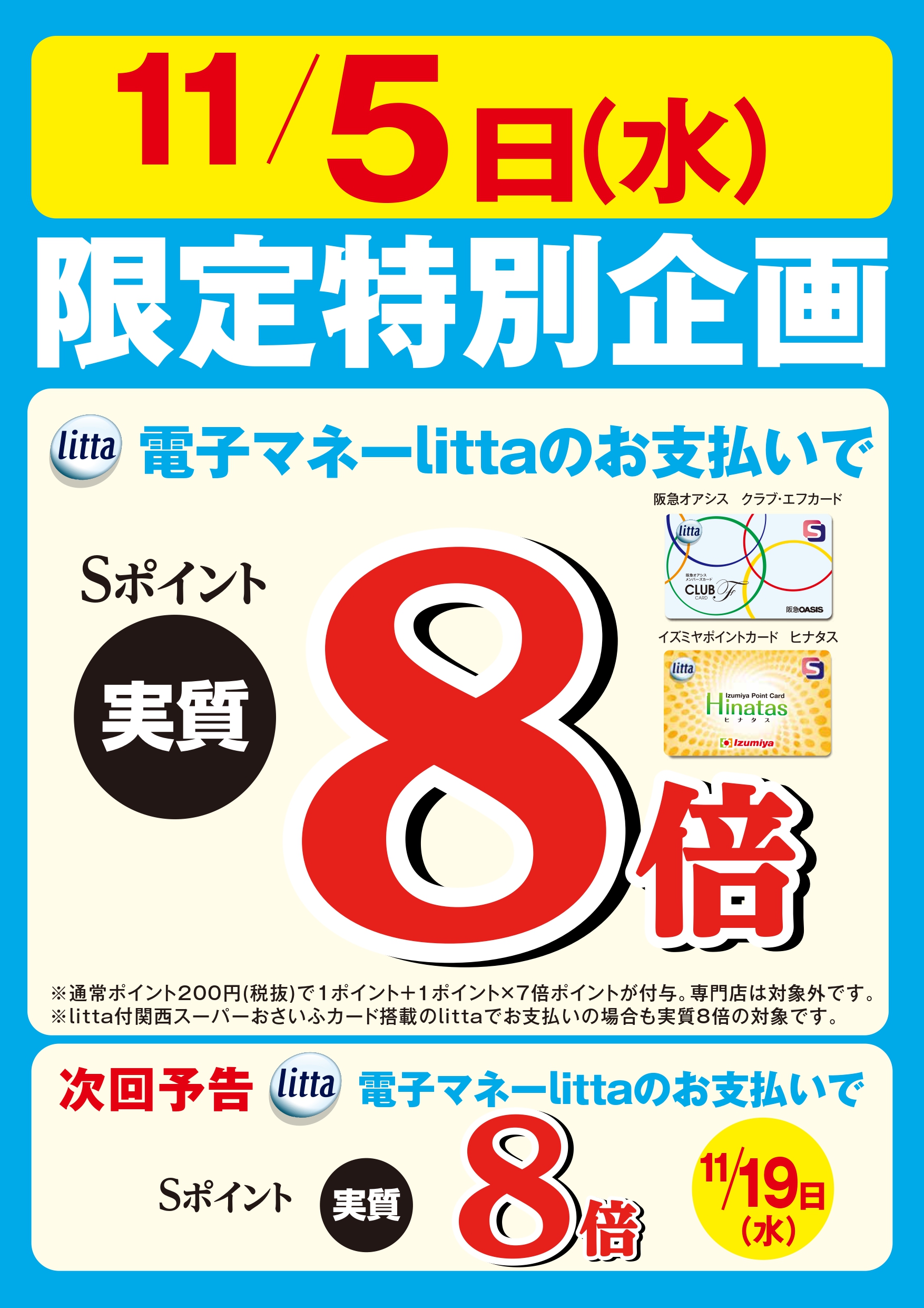 11月5日(水)限定特別企画!クラブ・エフカード、ヒナタスカード搭載 電子マネーlittaのお支払いでSポイント実質8倍!