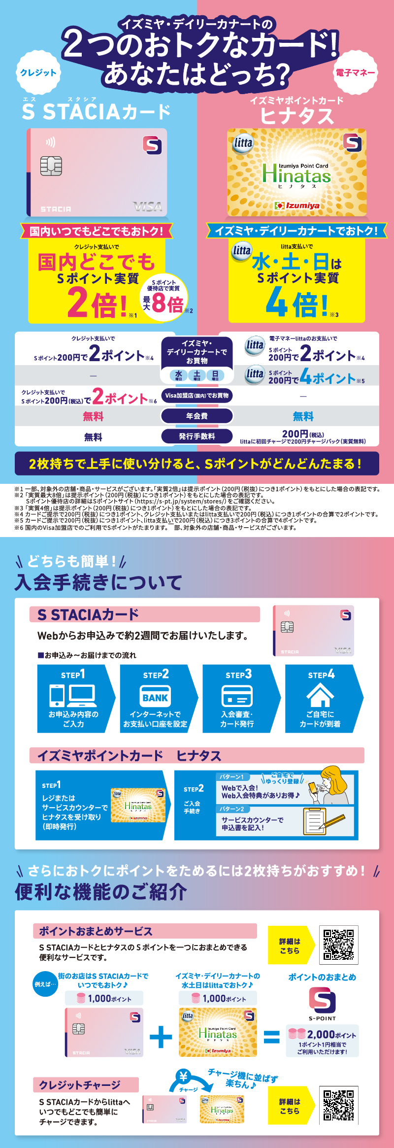 2025.11.04 特集 イズミヤ・デイリーカナートの2つのおトクなカード!あなたならどっち? ▶SSTACIAカードのお申し込みはコチラ ▶ポイントおまとめサービス詳細はコチラ ▶クレジットチャージ詳細はコチラ 前の記事 次の記事 特集一覧へ戻る