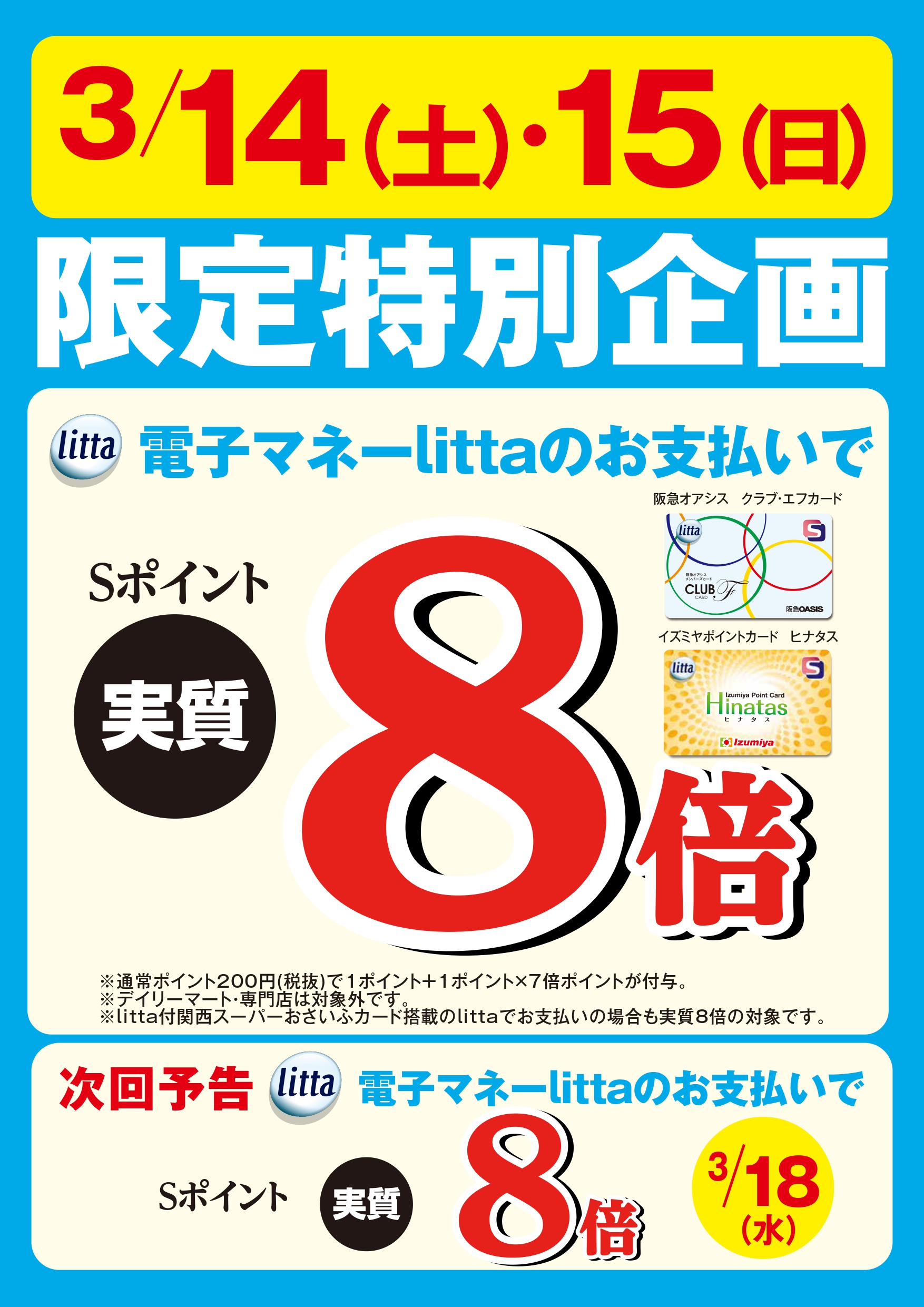 2026.03.09 キャンペーン 3月14日(土)・15日(日)限定特別企画!クラブ・エフカード、ヒナタスカード搭載 電子マネーlittaのお支払いでSポイント実質8倍! ※3月14日(土)・15日(日)、次回3月18日(水)は宝塚南口駅前店では実施いたしません 次の記事 特集一覧へ戻る