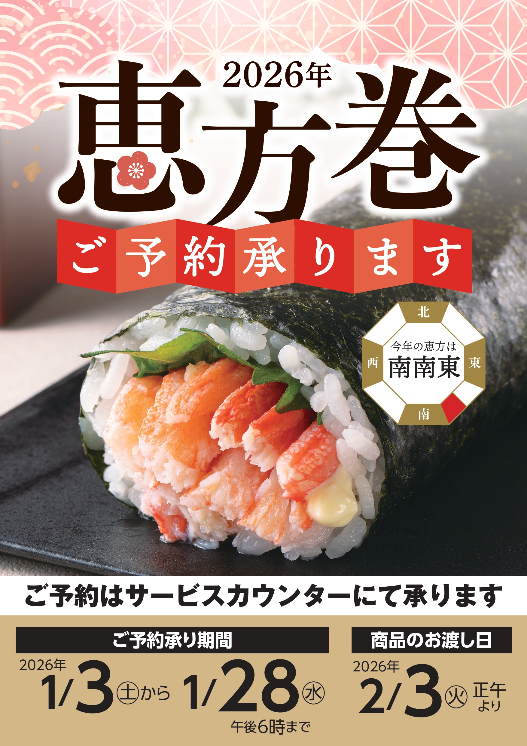 2026.01.03 特集 2026年恵方巻ご予約承ります 承りは1月28日(水)午後6時まで 詳しくは店頭予約リーフレットまたは各店のチラシをご覧ください※一部取り扱いのない店舗がございます ▶各店チラシページはこちら 前の記事 次の記事 特集一覧へ戻る