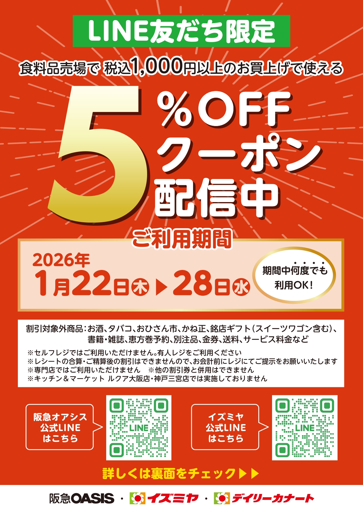 2026.01.15 キャンペーン LINE友だち限定 食料品売場で税込1,000円以上のお買上げで使える5%OFFクーポン配信中! ▼イズミヤ公式LINEの友だち追加はこちらから▼ 前の記事 次の記事 特集一覧へ戻る