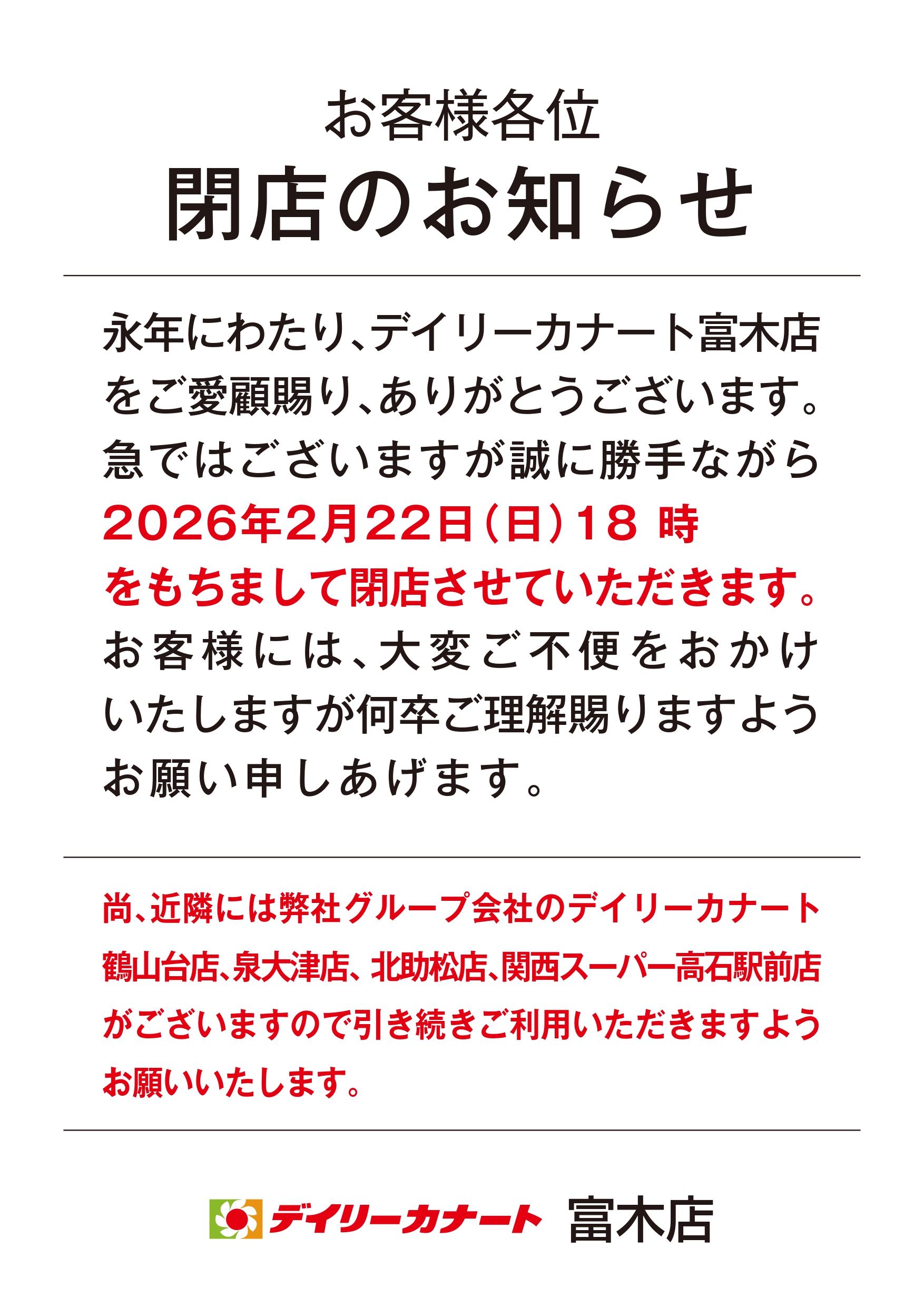 2月22日(日)富木店 閉店のお知らせ